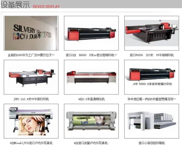 公司拥有5米UV卷材喷印机多台、大型UV平板喷印机多台,进口罗兰户内外写真机40余台、高清快速喷绘机8台、热升华旗帜机多台等,全自动拼接机、全自动异型切割机,全自动覆膜机等全套高标准配备后道设备。全面覆盖高中低端各界客户需求及从设计到售后的全企业服务链,日出图可达上万平方米,产量高、质量好、价格低、交货快。